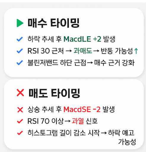 👉 그래서 RSI나 볼린저밴드 같은 보조지표와 함께 확인하는 게 좋아요.